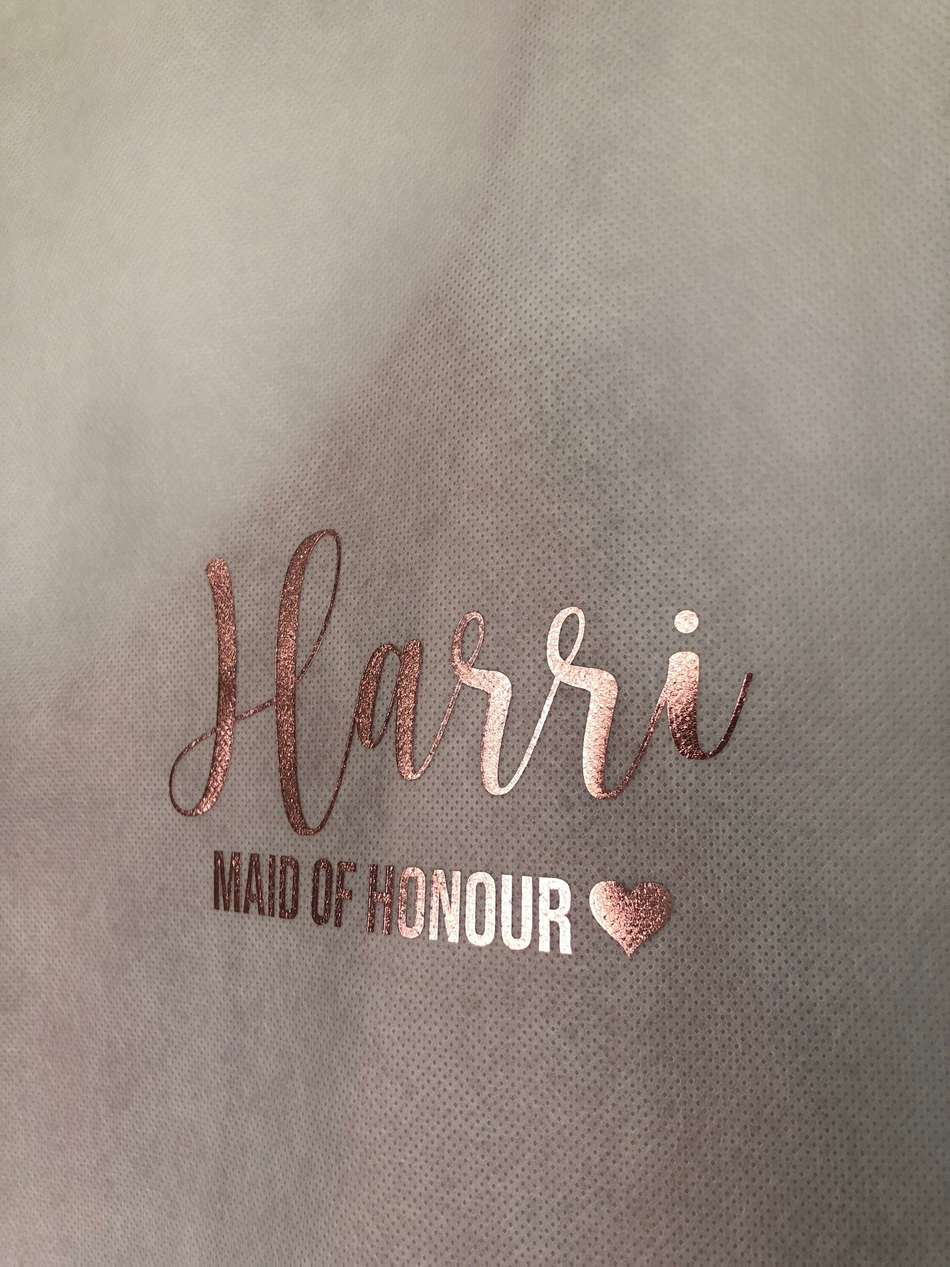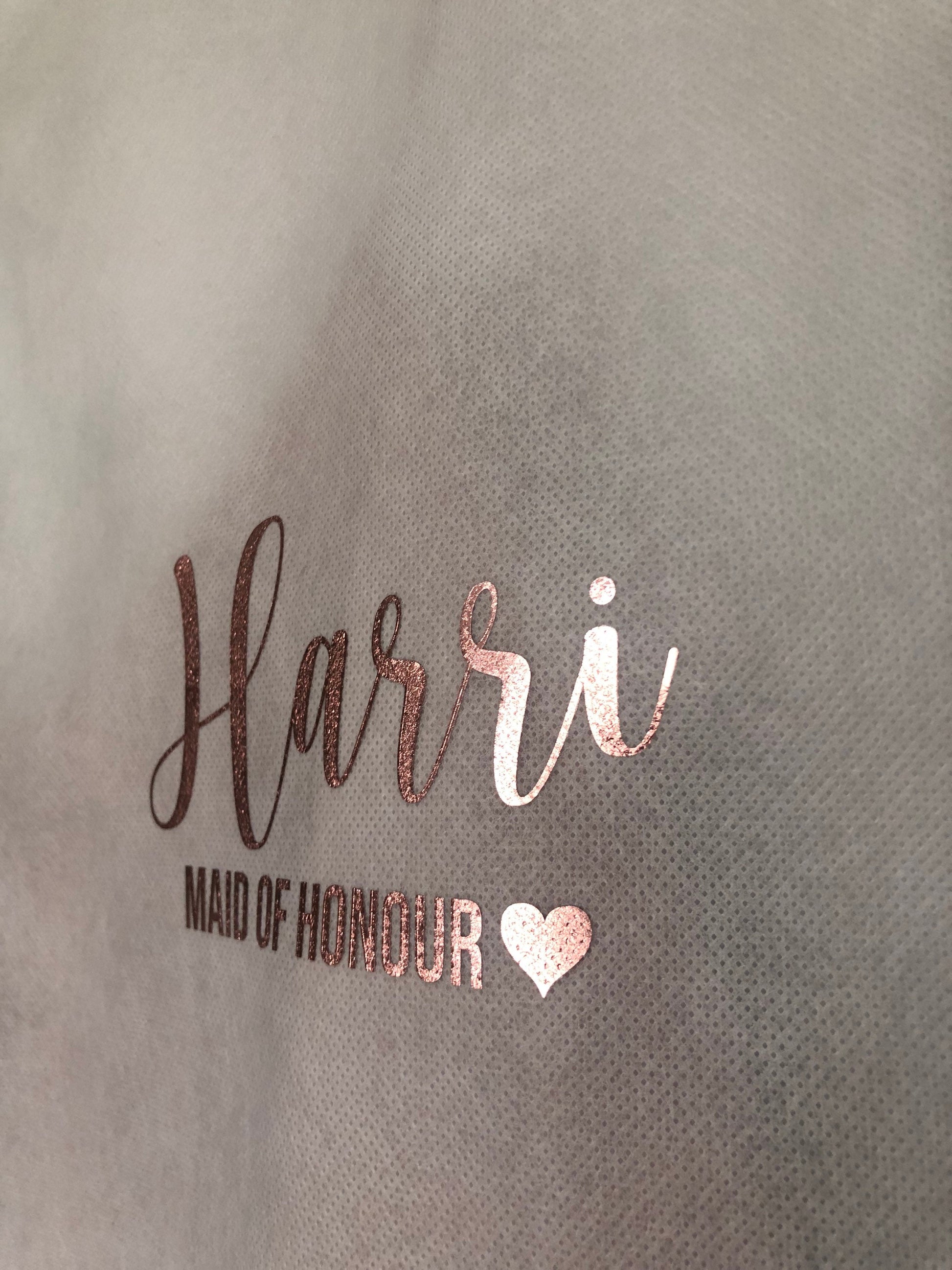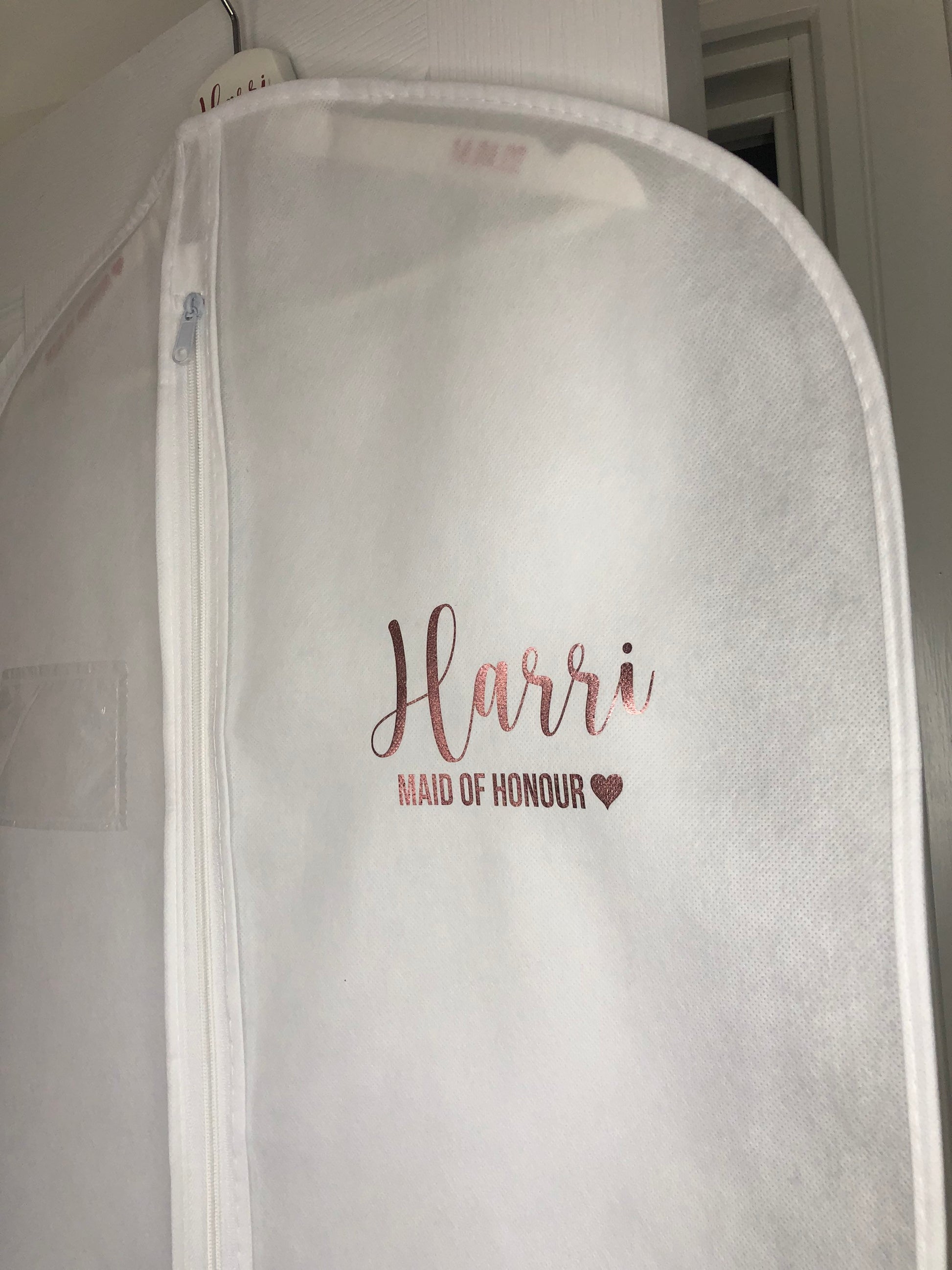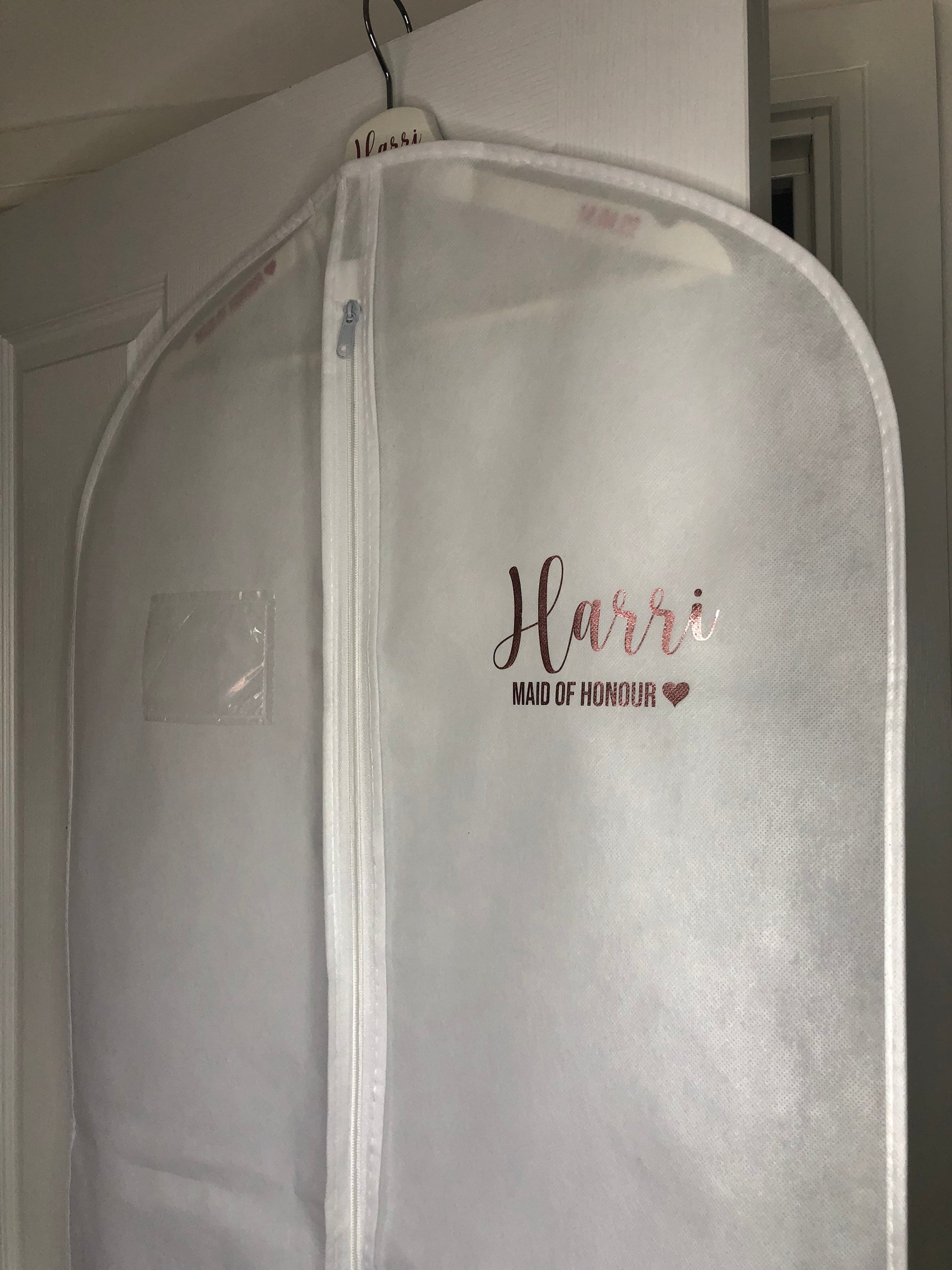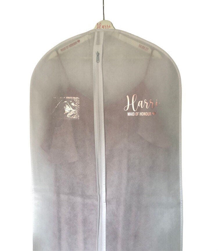 The dress bags are white and are 72in long. They can be personalised with either gold, rose gold or silver fonts.